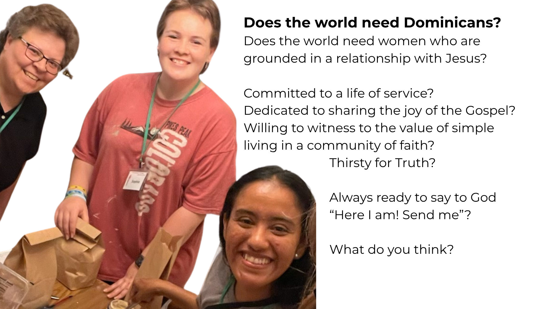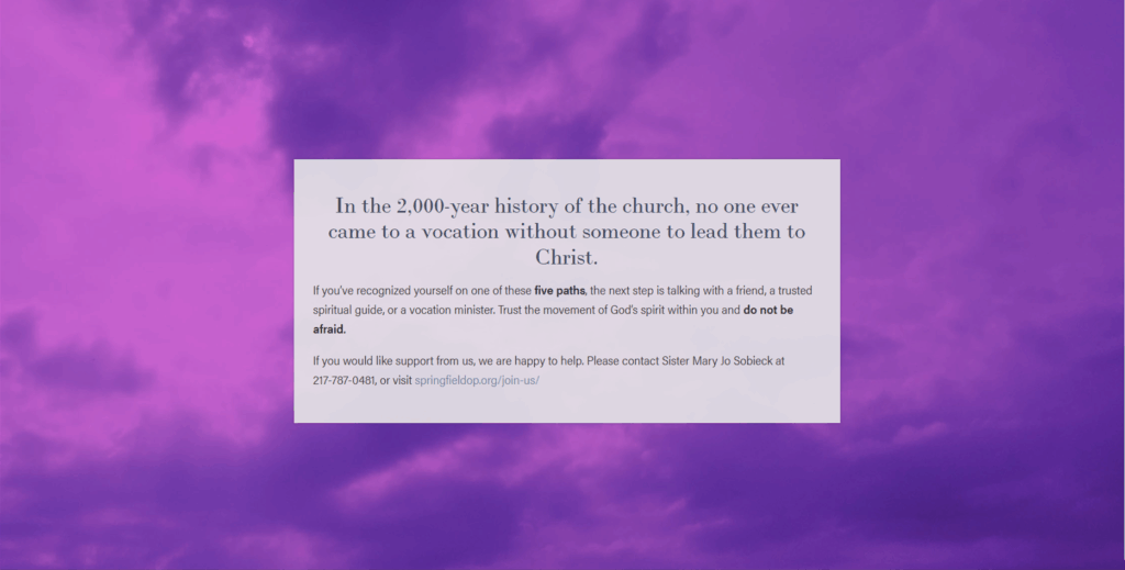 I'm Sister Mary Jo Sobieck, minister of vocation animation for the Dominican Sisters of Springfield, Illinois.