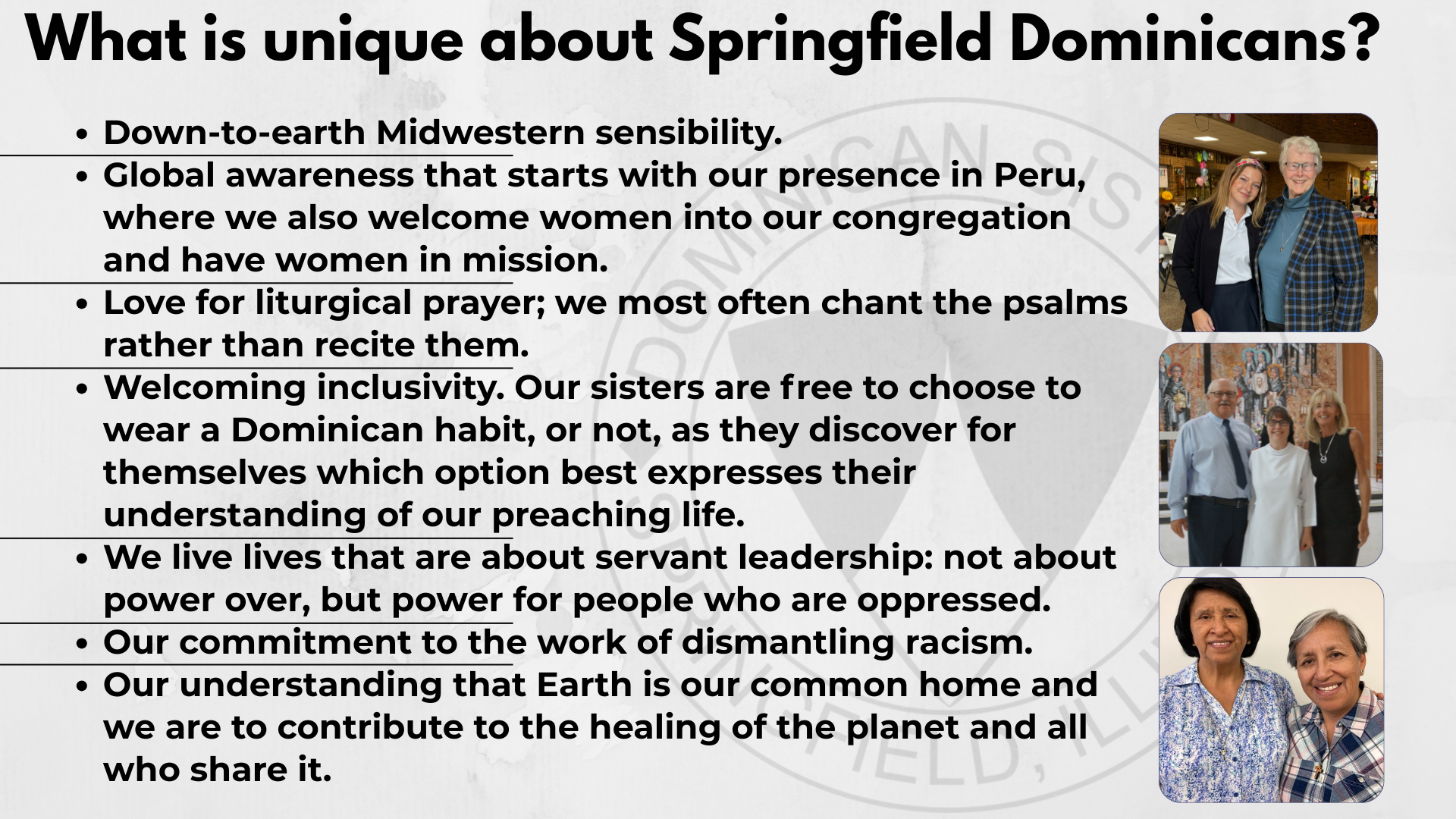 The Dominican Sisters of Springfield are part of a worldwide Dominican family, the Order of Preachers, and in 2023 are celebrating 150 years of ministry For the Life of the World. Their sisters minister in the United States and Peru. For more than 800 years, Dominicans have communicated the Gospel in word and action. Today, thousands of Dominican sisters, nuns, priests, brothers, associates, and laity minister in more than 100 countries around the world.