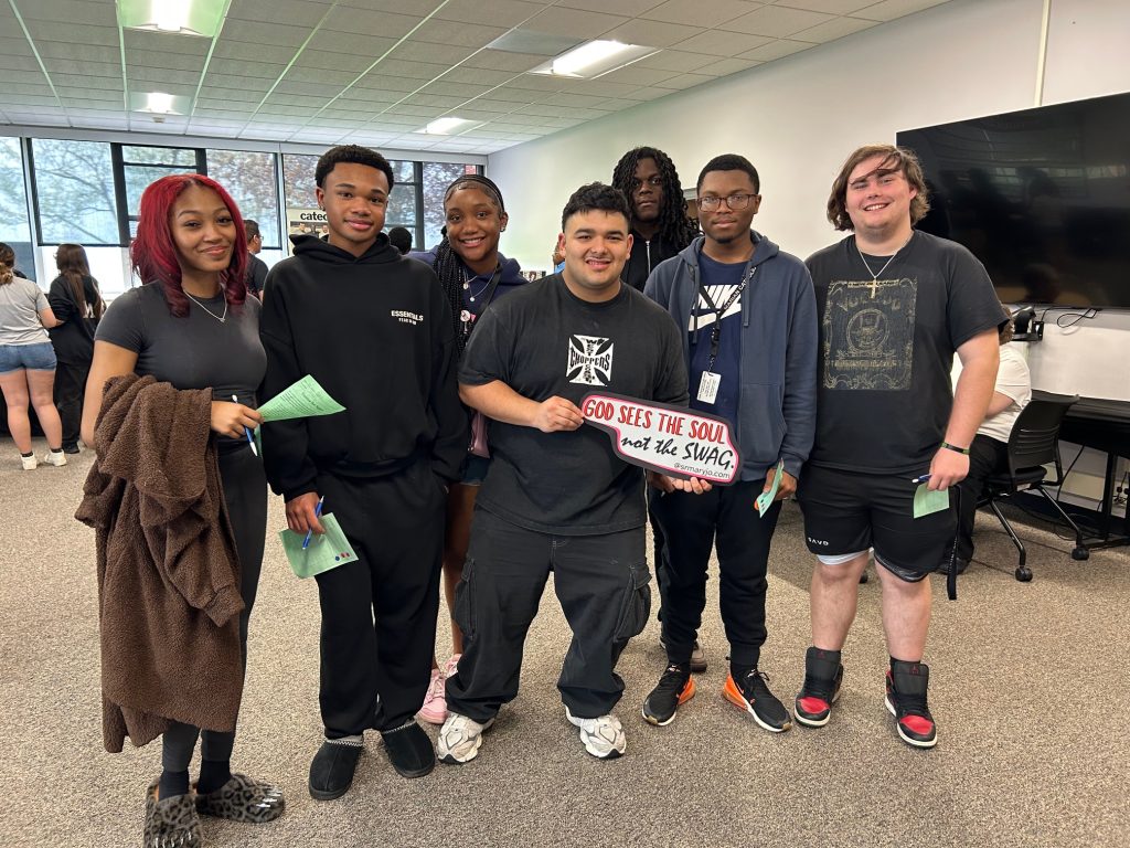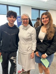 Two Viatorian priests, an associate representative for the Claretian Missionaries, and a priest from the Archdiocese of Chicago joined them to offer a day of encounter for grades 11-12. During each theology class period, students visited exhibits and had time to ask questions and peruse materials on display at each congregation’s table. Stickers, buttons, pens, and gift cards were given and received with much enthusiasm. In all, the day provided students with a unique opportunity to meet and talk with religious men and women who have responded joyfully to the call of God on their heart to give themselves generously for the life of the world.